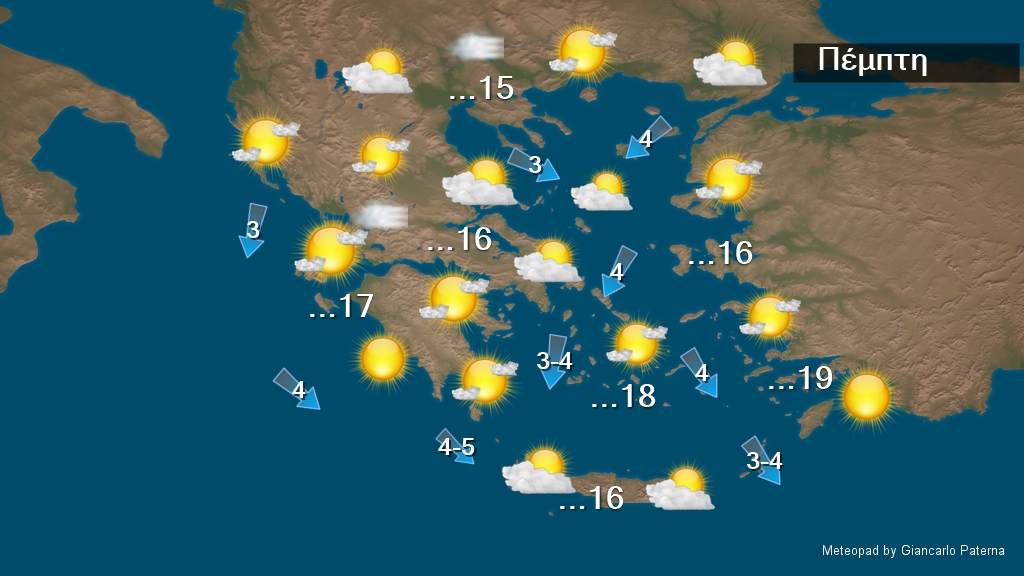 Στα δυτικά, τα νησιά του Ανατολικού Αιγαίου, τα Δωδεκάνησα και την Κρήτη προβλέπονται παροδικά αυξημένες νεφώσεις με τοπικές βροχές. Στην υπόλοιπη χώρα λίγες νεφώσεις με τοπικά περιορισμένη ορατότητα στα ηπειρωτικά τις πρωινές και βραδινές ώρες. Οι άνεμοι θα πνέουν μεταβλητοί 3 με 4 και στο βόρειο Αιγαίο ανατολικοί βορειοανατολικοί 4 τοπικά 5 μποφόρ. Η θερμοκρασία δεν θα σημειώσει αξιόλογη μεταβολή.