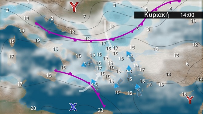 Στα δυτικά, τα κεντρικά, τα βόρεια, τα νησιά του βορείου και ανατολικού Αιγαίου και τις Κυκλάδες προβλέπεται συννεφιά με βροχές και σποραδικές καταιγίδες. Στην υπόλοιπη χώρα νεφώσεις παροδικά αυξημένες με τοπικές βροχές. Χιονοπτώσεις θα σημειωθούν στα ηπειρωτικά ορεινά .Οι άνεμοι θα πνέουν από ανατολικές διευθύνσεις 5 με 6 μποφόρ που βαθμιαία και από τα δυτικά θα στραφούν σε βόρειους με την ίδια ένταση.. Η θερμοκρασία σε πτώση.