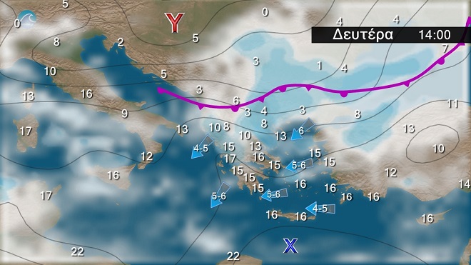Στα δυτικά, τα κεντρικά, τα βόρεια, τα νησιά του βορείου και ανατολικού Αιγαίου και τις Κυκλάδες συννεφιά με βροχές και σποραδικές καταιγίδες. Στην υπόλοιπη χώρα νεφώσεις παροδικά αυξημένες με τοπικές βροχές. Χιονοπτώσεις θα σημειωθούν στα ηπειρωτικά ορεινά καθώς και σε ημιορεινές περιοχής της κεντρικής και της βόρειας Ελλάδας. Οι άνεμοι θα πνέουν από βόρειες διευθύνσεις 3 με 5 και τοπικά 6 μποφόρ. Η θερμοκρασία σε πτώση.