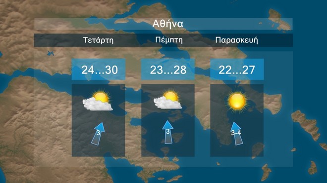 Στην Αθήνα προβλέπονται λίγες τοπικές νεφώσεις. Η θερμοκρασία θα έχει μέγιστες τιμές περί τους 27 με 30 βαθμούς Κελσίου.