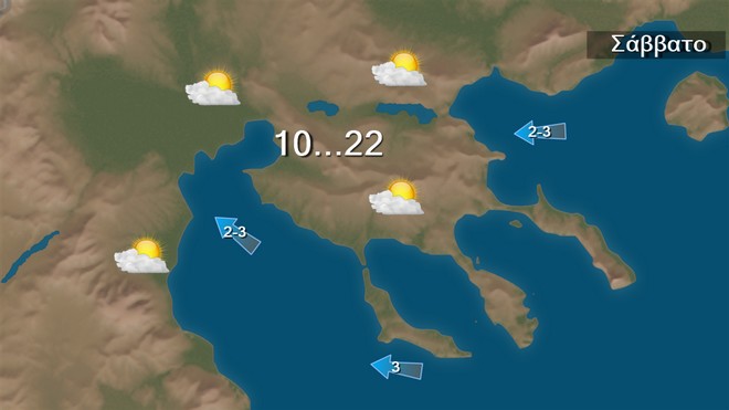 Το Σάββατο σε όλη τη χώρα μέχρι το απόγευμα προβλέπεται αραιή συννεφιά και λίγες ασθενείς βροχές. Τις βραδινές ώρες τοπικές βροχές θα εκδηλωθούν κυρίως στη δυτική και τη νότια χώρα. Οι μετεωρολογικές συνθήκες ευνοούν τη μεταφορά αφρικανικής σκόνης. Οι άνεμοι θα πνέουν στα νότια ανατολικοί 5 με 6 μποφόρ. Η θερμοκρασία δεν θα σημειώσει αξιόλογη μεταβολή και θα φτάσει στα ηπειρωτικά κατά τόπους τους 23 βαθμούς Κελσίου.