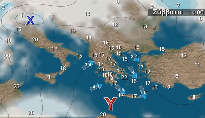 Μεταβολή του καιρού με βροχές, αρχικά στα δυτικά, από τις μεσημβρινές ώρες στα υπόλοιπα ηπειρωτικά (κυρίως στα κεντρικά και βόρεια) και αργότερα στα νησιά του ανατολικού Αιγαίου και τα Δωδεκάνησα. Σποραδικές καταιγίδες θα εκδηλωθούν στα βορειοδυτικά, από το απόγευμα στη Θράκη και τη νύχτα στο ανατολικό Αιγαίο. Βαθμιαία στα δυτικά τα φαινόμενα θα εξασθενήσουν. Ευνοείται η μεταφορά αφρικανικής σκόνης. Οι άνεμοι θα πνέουν νότιοι νοτιοανατολικοί 5 με 7 και στο Αιγαίο 8 μποφόρ. Και από τις βραδινές ώρες στα δυτικά θα στραφούν σε δυτικούς 5 με 6 μποφόρ. Η θερμοκρασία θα σημειώσει πτώση ως προς τις μέγιστες τιμές κυρίως στο Ιόνιο και τα ηπειρωτικά, ωστόσο θα παραμείνει σε υψηλά για την εποχή επίπεδα.