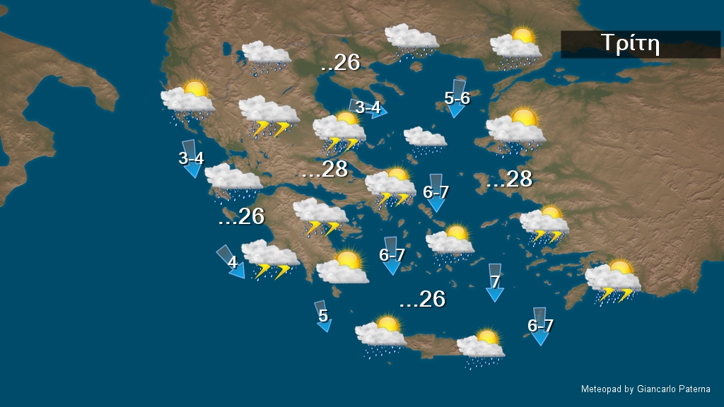 Στην κεντρική Μακεδονία, τη Θεσσαλία, την ανατολική Στερεά, την Εύβοια και την Κρήτη λίγες νεφώσεις κατά περιόδους αυξημένες με πιθανότητα τοπικών βροχών κυρίως στη βόρεια Κρήτη. Στην υπόλοιπη χώρα γενικά αίθριος καιρός με πρόσκαιρες νεφώσεις κυρίως τις μεσημβρινές και απογευματινές ώρες στα ηπειρωτικά. Οι άνεμοι θα πνέουν από βόρειες διευθύνσεις 4 με 6 και στο Αιγαίο τοπικά 7 μποφόρ. Η θερμοκρασία θα σημειώσει πτώση στα βόρεια, όπου δε θα ξεπεράσει τους 30 βαθμούς, ενώ στην υπόλοιπη χώρα θα φτάσει τους 31 με 33 βαθμούς Κελσίου.