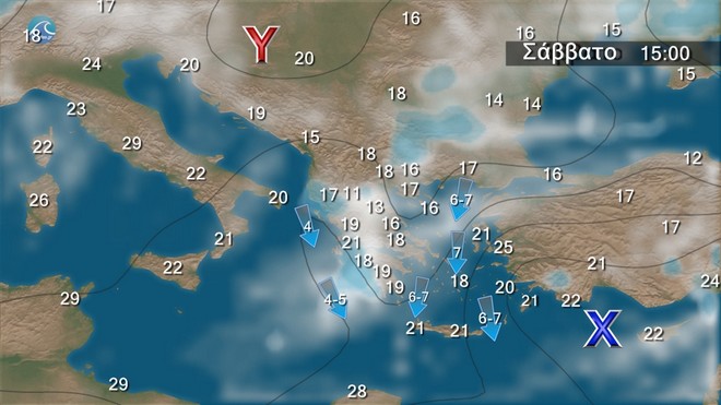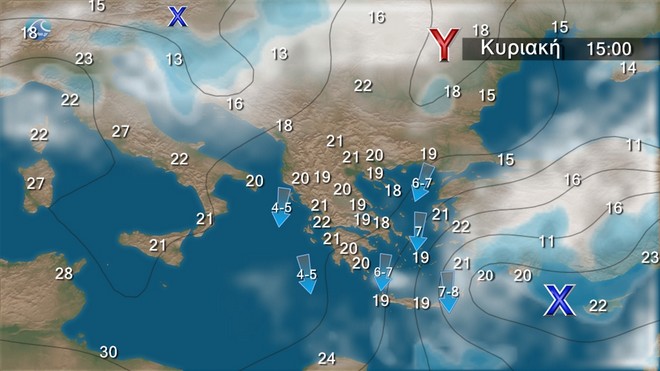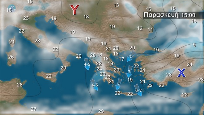 Γενικά αίθριος καιρός, με παροδικές νεφώσεις στα ανατολικά και νότια. Οι άνεμοι θα πνέουν στα δυτικά μεταβλητοί 3 με 4 μποφόρ, στα ανατολικά από βόρειες διευθύνσεις 4 με 6, στο Αιγαίο 7 μποφόρ και τοπικά στα νοτιοανατολικά 8 μποφόρ. Η θερμοκρασία δεν θα σημειώσει αξιόλογη μεταβολή.