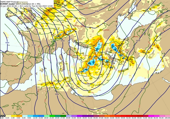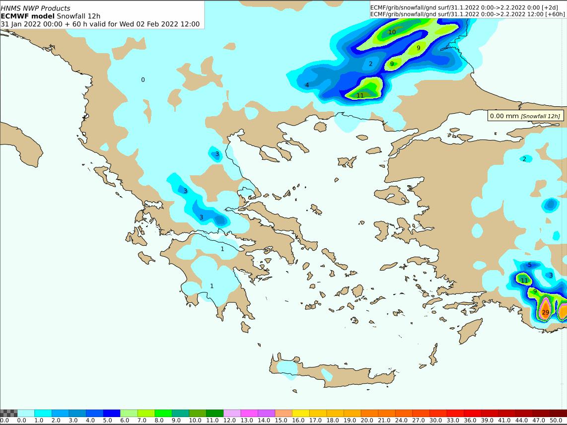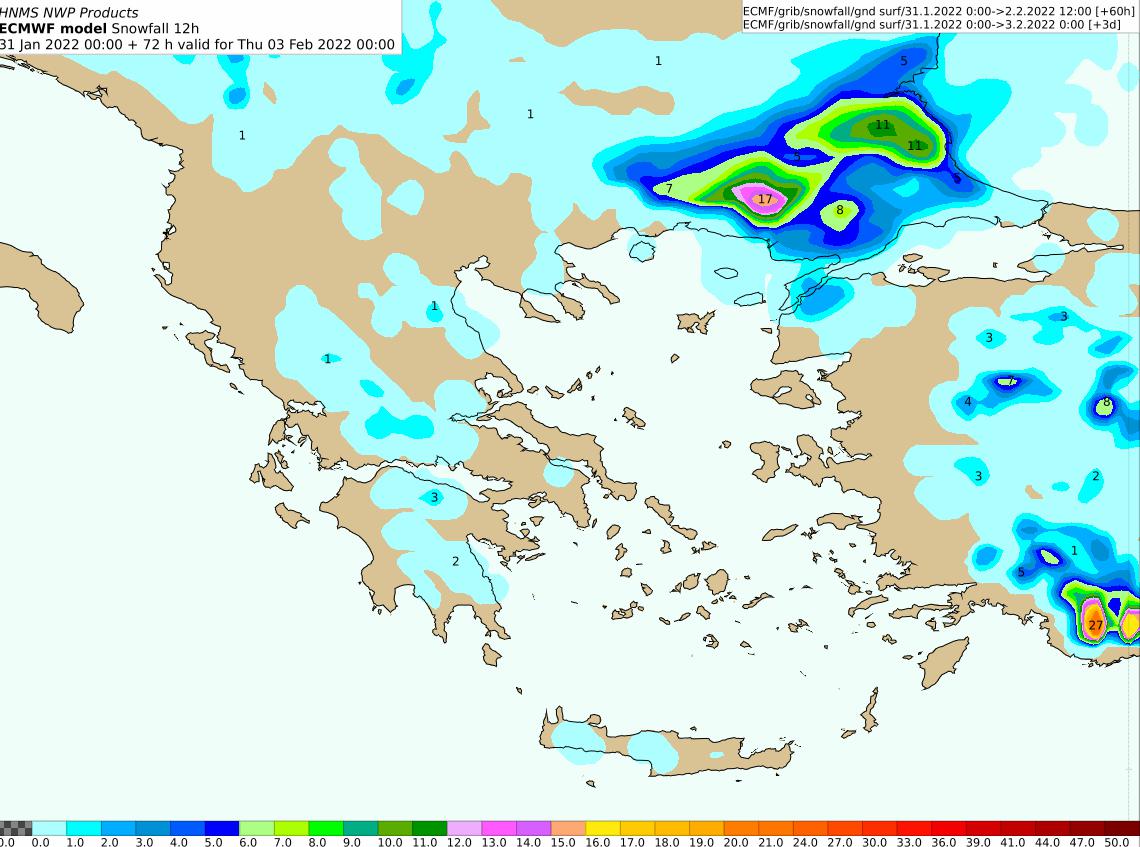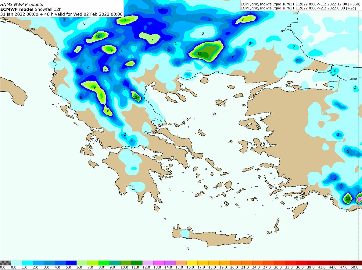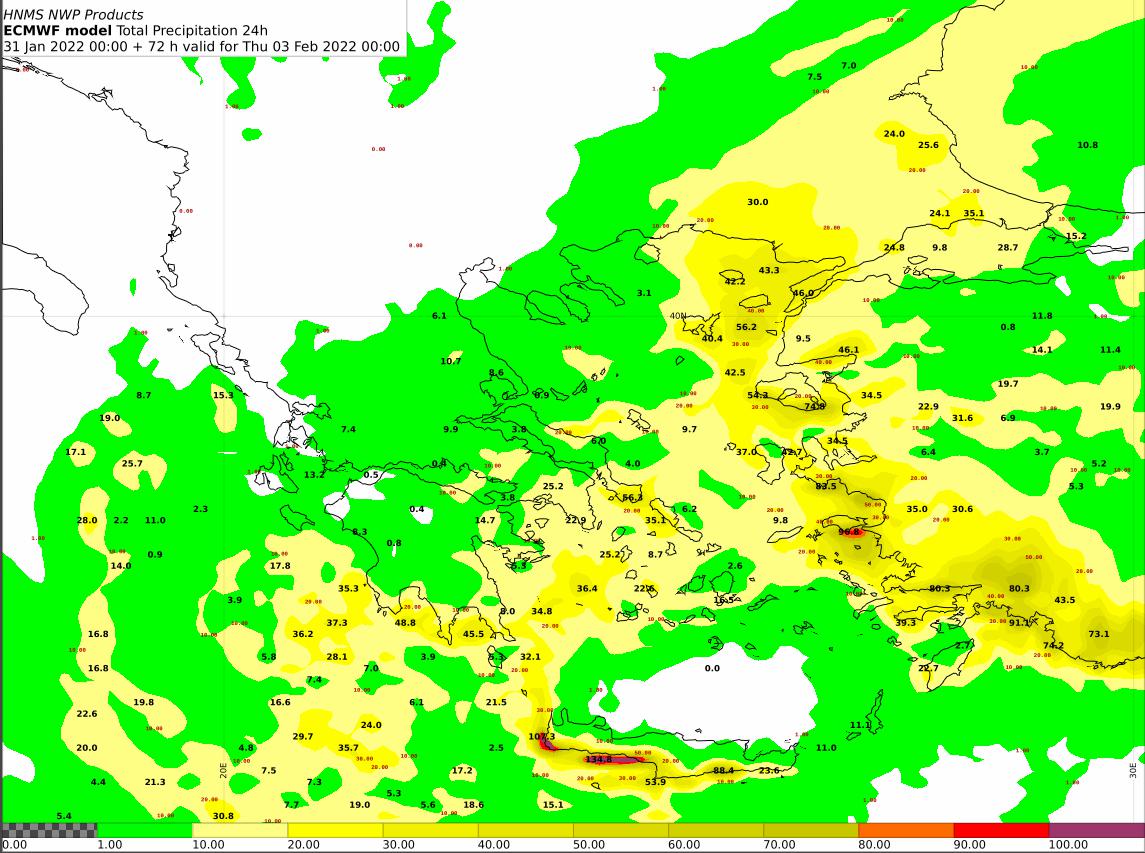 Την Τετάρτη θα συνεχιστούν οι κατά τόπους ισχυρές βροχές και καταιγίδες που θα  επεκταθούν βαθμιαία από τις πρωινές ώρες στη Θεσσαλία, τις Σποράδες, την Εύβοια, την ανατολική Στερεά και πρόσκαιρα στην ανατολική Πελοπόννησο. Από το μεσημέρι προς το απόγευμα τα φαινόμενα θα επεκταθούν στις Κυκλάδες, την Κρήτη και τα Δωδεκάνησα. Οι χιονοπτώσεις θα είναι κατά τόπους πυκνές και θα σημειωθούν στα ορεινά της ηπειρωτικής χώρας, στα ημιορεινά της κεντρικής και βόρειας Ελλάδας,καθώς και σε περιοχές με χαμηλότερο υψόμετρο της Θράκης. Εξασθένηση των φαινομένων αναμένεται στο βόρειο Ιόνιο, την Ήπειρο και τη δυτική Στερεά το μεσημέρι και στη Θεσσαλία, τις Σποράδες και την Εύβοια το βράδυ. Αυτό διακρίνεται πολύ καλά στη συνολική χιονόπτωση 12ωρου από Τετάρτη μεσημέρι και μετά.