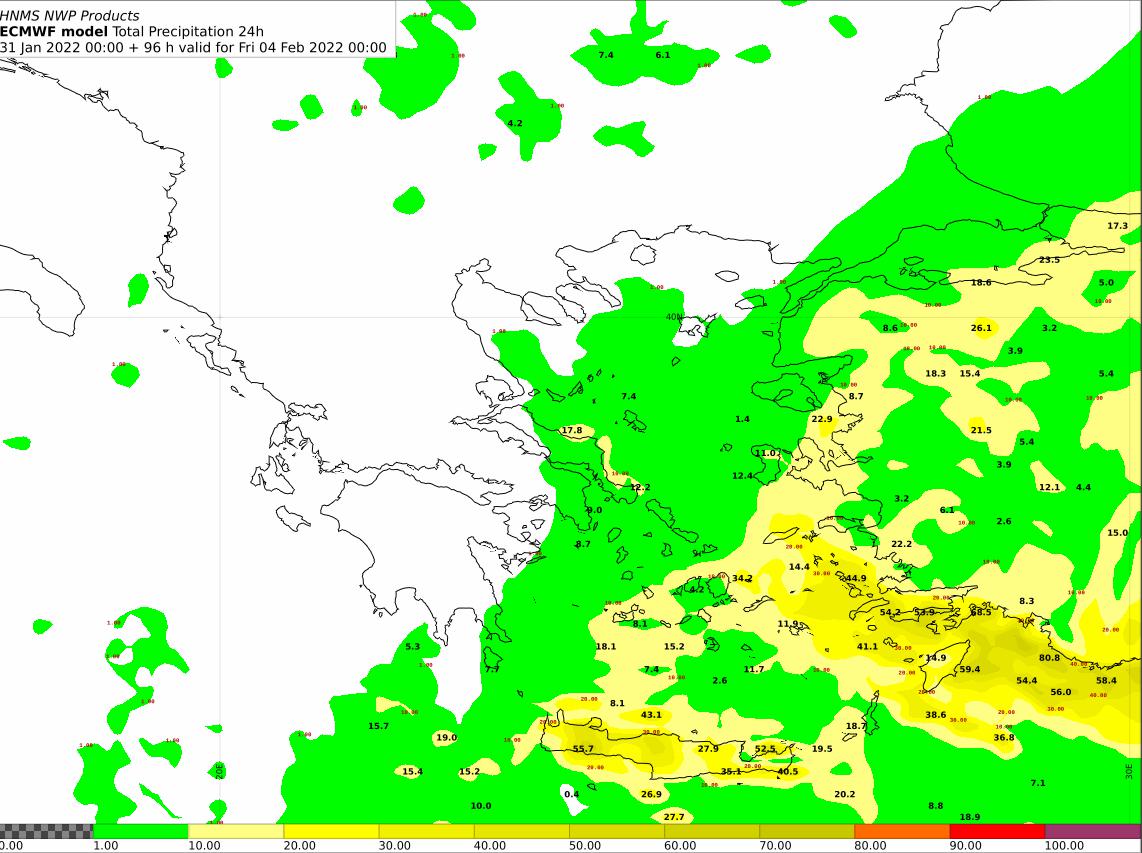 Την Πέμπτη βροχές και καταιγίδες κατά τόπους ισχυρές θα εκδηλωθούν στην Κρήτη, τις Κυκλάδες, τα νησιά του ανατολικού Αιγαίου και τα Δωδεκάνησα και πρόσκαιρα μέχρι το μεσημέρι στην ανατολική Στερεά και την ανατολική Πελοπόννησο. Τα φαινόμενα θα εξασθενήσουν αρχικά στα νησιά του ανατολικού Αιγαίου και σταδιακά μέχρι το βράδυ και στις υπόλοιπες περιοχές. Χιονοπτώσεις κατά τόπους πυκνές θα σημειωθούν στα ορεινά και ημιορεινά της κεντρικής και βόρειας χώρας και τις πρωινές ώρες και σε περιοχές της Θράκης με χαμηλότερο υψόμετρο.