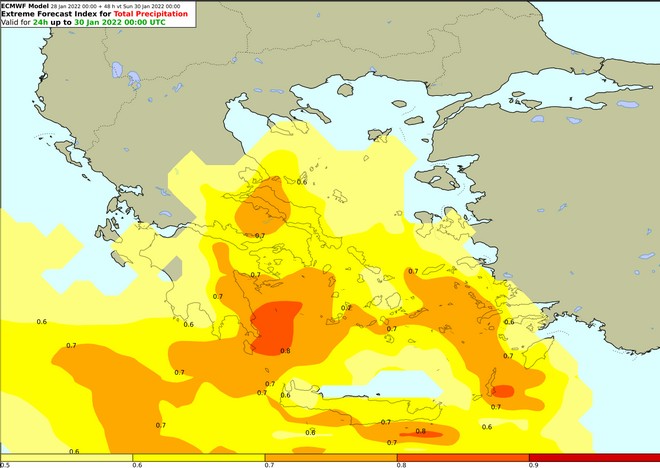 Ο δείκτης επικινδυνότατος EFI (Extreme Forecast Index) βρίσκεται σε πορτοκαλί όρια, με τα μεγαλύτερα ύψη βροχής να εκδηλώνονται πάνω από τις θαλάσσιες περιοχές. Αυτό τονίζεται και στη γενική πρόγνωση της ΕΜΥ.