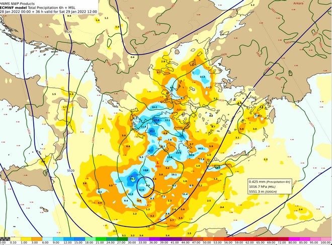 Στην παραπάνω ανάρτηση μπορείτε να διακρίνεται τα ύψη του υετού ανά 6ωρο τα οποία δεν είναι πολύ υψηλά. Ωστόσο, επειδή υπάρχει διαδικασία κυκλογέννεσης (δημιουργία επιφανειακού χαμηλού) θα πρέπει να έχουμε κάποια εγρήγορση, καθώς αυτές οι μικρές διαταραχές συνήθως δεν παρουσιάζουν υψηλή προγνωσιμότητα.