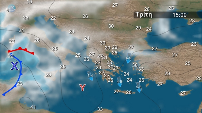 Γενικά αίθριος καιρός με πρόσκαιρες νεφώσεις στα δυτικά και βόρεια ηπειρωτικά τις μεσημβρινές και απογευματινές ώρες. Οι άνεμοι θα πνέουν στα δυτικά μεταβλητοί ασθενείς και βαθμιαία βορειοδυτικοί 3 με 5 μποφόρ, στα ανατολικά από βόρειες διευθύνσεις 4 με 6 και στο Αιγαίο τοπικά 7 μποφόρ. Η θερμοκρασία δεν θα σημειώσει αξιόλογη μεταβολή.