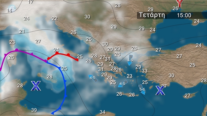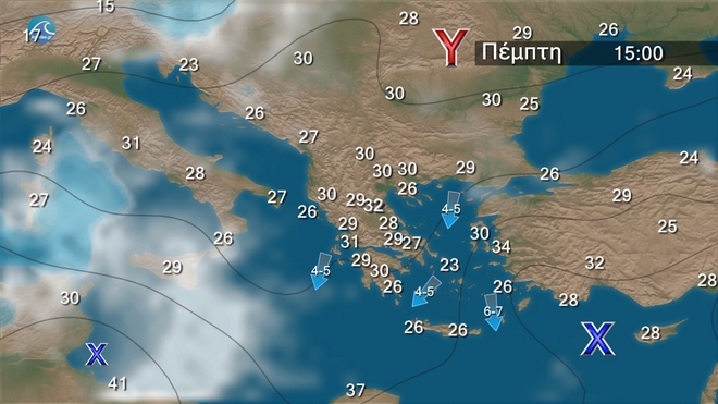 Οι άνεμοι θα πνέουν στα δυτικά ανατολικοί νοτιοανατολικοί 3 με 5 μποφόρ και βαθμιαία μεταβλητοί ασθενείς. Στα ανατολικά θα πνέουν από βόρειες διευθύνσεις 4 με 6 και στο Αιγαίο τοπικά 7 μποφόρ. Η θερμοκρασία δεν θα σημειώσει αξιόλογη μεταβολή.