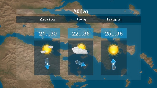 Στην Αθήνα προβλέπεται σχεδόν αίθριος καιρός. Η θερμοκρασία θα κυμανθεί μεταξύ 30 και 36 βαθμών Κελσίου.