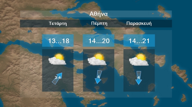 Οι άνεμοι στο νοτιοανατολικό Αιγαίο θα πνέουν βόρειοι βορειοδυτικοί 4 με 6 μποφόρ. Στην υπόλοιπη χώρα θα είναι ασθενείς και βαθμιαία ανατολικών διευθύνσεων έως 4 μποφόρ. Η θερμοκρασία θα σημειώσει μικρή άνοδο και θα φθάσει τους 17 με 19 και τοπικά στα ηπειρωτικά τους 20 με 22 βαθμούς Κελσίου.
