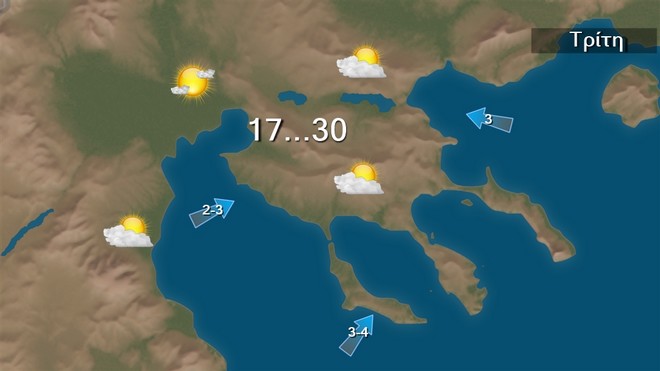 Σήμερα Τρίτη προβλέπεται γενικά αίθριος καιρός, με πρόσκαιρες νεφώσεις στα ηπειρωτικά τις μεσημβρινές και απογευματινές ώρες οπότε θα εκδηλωθούν τοπικοί όμβροι στα ορεινά και στα βορειοανατολικά ορεινά μεμονωμένες καταιγίδες.