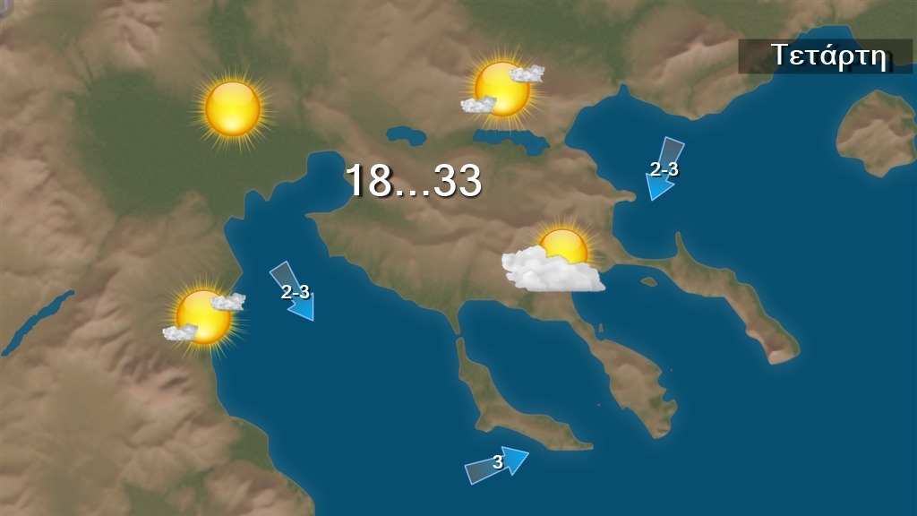 Σήμερα Τετάρτη προβλέπεται γενικά αίθριος καιρός. Πρόσκαιρες τοπικές νεφώσεις θα υπάρχουν τις μεσημβρινές και απογευματινές ώρες στα ηπειρωτικά, όπου πιθανόν να σημειωθούν τοπικοί όμβροι στα ορεινά. Οι άνεμοι θα πνέουν από βόρειες διευθύνσεις 3 με 5 και στο Αιγαίο τοπικά 6 και στα ανατολικά έως 7 μποφόρ. Η θερμοκρασία θα σημειώσει μικρή άνοδο και θα φτάσει στο Ιόνιο και τα ηπειρωτικά τους 33 με 35 βαθμούς και στο Αιγαίο τους 29 με 30 βαθμούς Κελσίου.