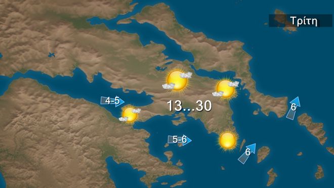 Σήμερα Τρίτη προβλέπεται γενικά αίθριος με τοπικά περιορισμένη ορατότητα τις πρωινές και βραδινές ώρες. Ευνοείται η μεταφορά σκόνης στα νότια. Οι άνεμοι στο Αιγαίο θα πνέουν από νότιες διευθύνσεις τοπικά έως 7 μποφόρ, με εξασθένηση το βράδυ. Η θερμοκρασία στα ανατολικά ηπειρωτικά θα ξεπεράσει κατά τόπους τους 30 βαθμούς Κελσίου και θα έχει μέγιστη τιμή στα βόρεια τους 30 βαθμούς στα υπόλοιπα ηπειρωτικά και το Ιόνιο τους 29 με 33 και στα νησιά του Αιγαίου τους 27 με 28 βαθμούς Κελσίου και τοπικά στη Κρήτη 31.
