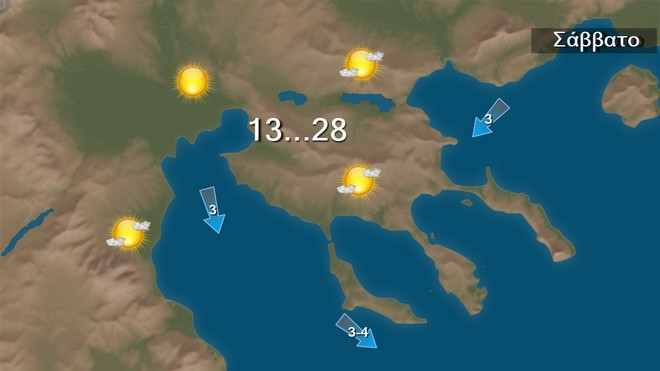 Το Σάββατο στις Κυκλάδες, την Κρήτη και τα Δωδεκάνησα προβλέπονται λίγες νεφώσεις πρόσκαιρα αυξημένες με τοπικές βροχές και πιθανώς μεμονωμένες καταιγίδες. Στην υπόλοιπη χώρα θα επικρατήσει γενικά αίθριος καιρός. Οι άνεμοι θα πνέουν από βόρειες διευθύνσεις 3 με 5 και μέχρι το μεσημέρι στο κεντρικό και νότιο Αιγαίο τοπικά 6 με 7 μποφόρ. Η θερμοκρασία θα σημειώσει άνοδο και θα κυμανθεί στα δυτικά και βόρεια ηπειρωτικά από 12 έως 28 με 29 βαθμούς Κελσίου, στα ανατολικά ηπειρωτικά από 14 έως 29 με 30 βαθμούς, στα νησιά του Ιονίου από 15 έως 27 και στην υπόλοιπη νησιωτική χώρα από 15 έως 23 με 25 βαθμούς Κελσίου.