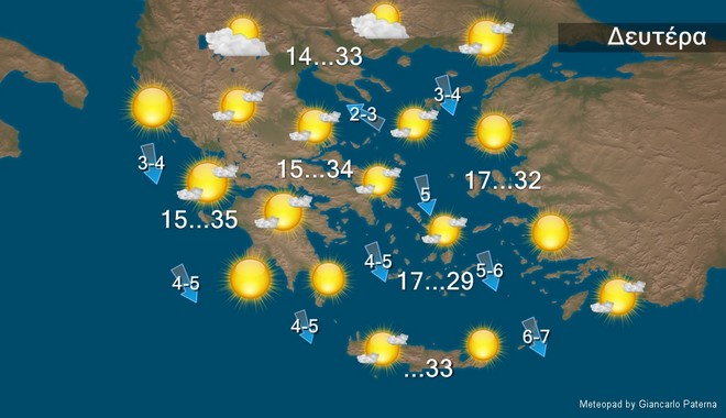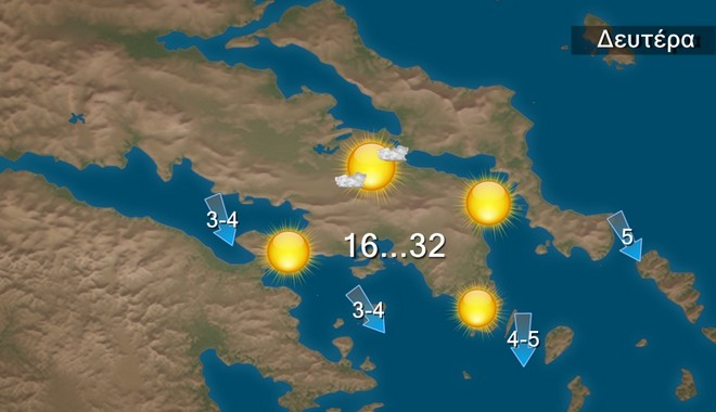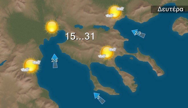 Τη Δευτέρα προβλέπεται σχεδόν αίθριος Οι άνεμοι θα πνέουν μεταβλητοί βόρειοι βορειοδυτικοί στο Ιόνιο 3 με 4 μποφόρ στα ανατολικά 4 με 6 και τοπικά στα νοτιοανατολικά τμήματα του Αιγαίου 6 με 7 μποφόρ. Η θερμοκρασία θα σημειώσει άνοδο σε όλη τη χώρα και θα φτάσει στα βόρεια περί τους 33 βαθμούς στο Ιόνιο και τα ηπειρωτικά 34 με 35 , στις Κυκλάδες και την Κρήτη τους 29 με 33 βαθμούς και στο Ανατολικό Αιγαίο και τα Δωδεκάνησα τους 32 βαθμούς Κελσίου