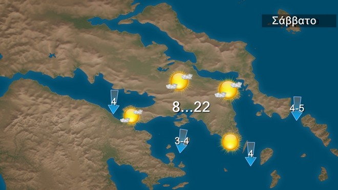 Για το Σάββατο προβλέπεται γενικά αίθριος καιρός σε όλη σχεδόν τη χώρα, με τοπικές νεφώσεις στα νότια και αργότερα αραιές νεφώσεις κυρίως στα δυτικά Οι άνεμοι θα πνέουν με ένταση έως 5 μποφόρ με εξασθένηση από το μεσημέρι. Η θερμοκρασία σε νέα άνοδο θα φτάσει σε υψηλά για την εποχή επίπεδα και θα φτάσει στα βόρεια τους 21 βαθμούς, στα υπόλοιπα ηπειρωτικά και το Ιόνιο τους 22 με 23 βαθμούς και στο Αιγαίο τους 11 με 18 βαθμούς Κελσίου.