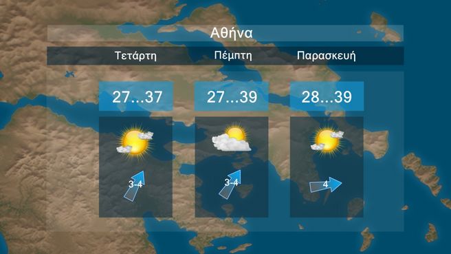 Στην Αθήνα προβλέπεται σχεδόν αίθριος καιρός. Η θερμοκρασία θα έχει μέγιστες τιμές περί τους 37 με 39 βαθμούς Κελσίου.