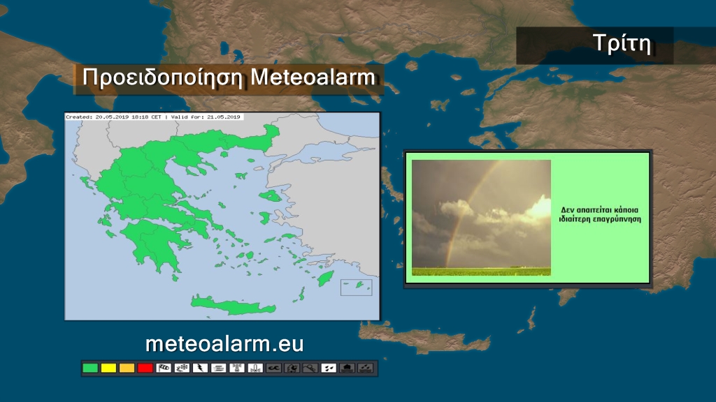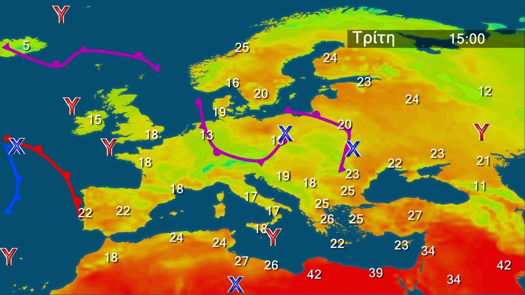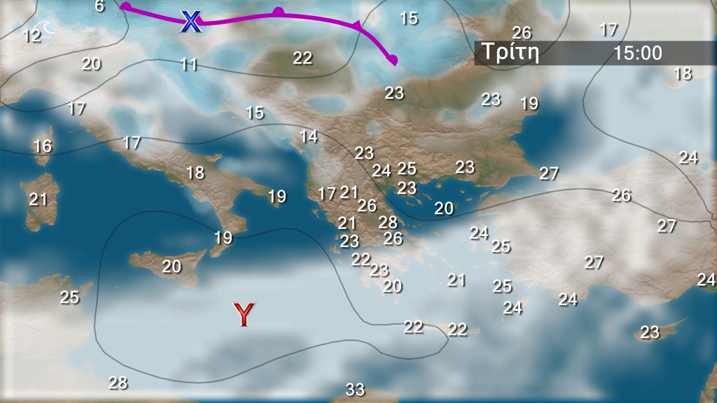 Στον χάρτη της Βαλκανικής διακρίνεται καλύτερα το ομαλό πεδίο στη χώρα μας και οι υψηλές πιέσεις στα νοτιοδυτικά . Έτσι την Τρίτη στα ανατολικά και τα νότια προβλέπονται λίγες νεφώσεις παροδικά αυξημένες. Στην υπόλοιπη χώρα αραιές νεφώσεις, πρόσκαιρα πιο πυκνές τις μεσημβρινές και απογευματινές ώρες με τοπικούς όμβρους στα βόρεια κυρίως ορεινά. Η ορατότητα, κυρίως τις πρωινές και βραδινές ώρες, θα είναι τοπικά περιορισμένη. Στην ατμόσφαιρα θα υπάρχουν αυξημένες ποσότητες αφρικανικής σκόνης. Οι άνεμοι θα πνέουν στα δυτικά βορειοδυτικοί 3 με 5 μποφόρ και στα ανατολικά από νότιες διευθύνσεις με την ίδια ένταση. Η θερμοκρασία δε θα σημειώσει αξιόλογη μεταβολή και θα φτάσει στα βόρεια τους 26 με 28 βαθμούς , στα υπόλοιπα ηπειρωτικά και το Ιόνιο τους 28 με 29 βαθμούς και στα νησιά του Αιγαίου τους 25 με 28 βαθμούς
