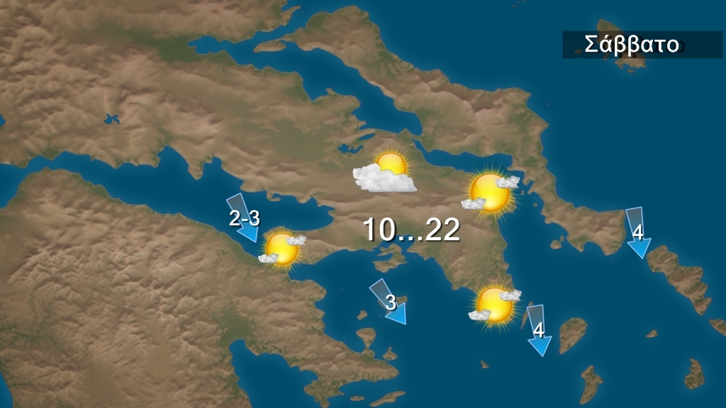 Για το Σάββατο προβλέπεται αίθριος καιρός αρχικά και βαθμιαία αραιές νεφώσεις σε όλη τη χώρα. Τοπικές βροχές θα εκδηλωθούν από το βράδυ στη Μακεδονία και τη Θράκη. Οι άνεμοι θα πνέουν στα πελάγη ΒΔ μέχρι 5 μποφόρ που αργότερα θα γίνουν ΝΔ .Η θερμοκρασία θα κυμανθεί σε υψηλά για την εποχή επίπεδα ως προς τις μέγιστες τιμές της. Η θερμοκρασία θα φτάσει στα βόρεια τους 22 βαθμούς, στα υπόλοιπα ηπειρωτικά και το Ιόνιο τους 22 με 23 βαθμούς Κελσίου και στο Αιγαίο τους 21 βαθμούς Κελσίου.