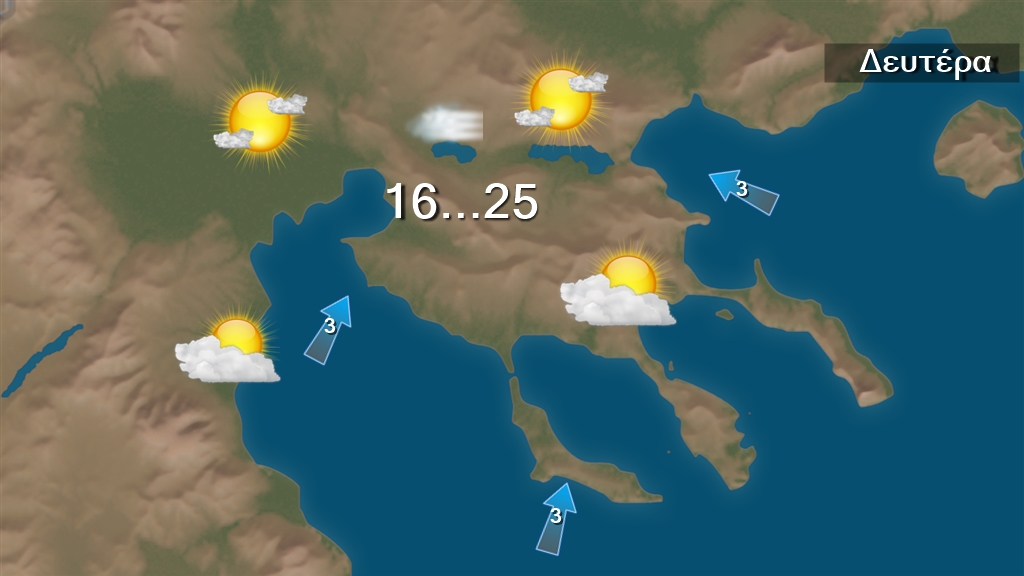 Σήμερα Δευτέρα στα δυτικά προβλέπονται αρχικά νεφώσεις με λίγες τοπικές βροχές στο Ιόνιο και γρήγορη βελτίωση. Στις υπόλοιπες περιοχές θα επικρατήσει γενικά αίθριος καιρός με παροδικές αραιές νεφώσεις. Η ορατότητα θα είναι τοπικά περιορισμένη τις πρωινές και βραδινές ώρες και θα σχηματιστούν τοπικές ομίχλες. Οι άνεμοι θα πνέουν μεταβλητοί 3 με 4 μποφόρ. Η θερμοκρασία δεν θα σημειώσει αξιόλογη μεταβολή , θα διατηρηθεί σε υψηλά επίπεδα και θα φτάσει τους 26 με 29 βαθμούς Κελσίου.