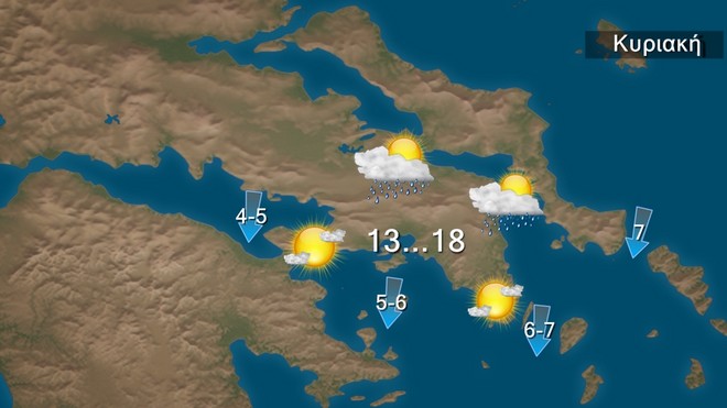 Την Κυριακή προβλέπονται τοπικές βροχές στην ανατολική και νότια χώρα, πρόσκαιρα ισχυρές τις πρωινές ώρες στην Εύβοια και τις Σποράδες όπου θα εκδηλωθούν και μεμονωμένες καταιγίδες. Οι βροχές βαθμιαία θα περιοριστούν στη βόρεια Κρήτη και στις υπόλοιπες περιοχές ο καιρός θα βελτιωθεί. Ευνοείται η μεταφορά αφρικανικής σκόνης μέχρι το μεσημέρι στη νοτιοανατολική νησιωτική χώρα. Οι άνεμοι θα πνέουν από βόρειες διευθύνσεις τοπικά στα ανατολικά έως 7 και βαθμιαία στο Αιγαίο έως 8 μποφόρ. Η θερμοκρασία θα κυμαίνεται σε επίπεδα λίγο κάτω από τα κανονικά και θα έχουμε μέγιστη τιμή στα βόρεια τους 18 βαθμούς Κελσίου, στα υπόλοιπα ηπειρωτικά και το Ιόνιο τους 18 με 19 βαθμούς, στις Κυκλάδες και την Κρήτη τους 18 με 20 βαθμούς και στο Ανατολικό Αιγαίο και Δωδεκάνησα τους 20 βαθμούς Κελσίου.
