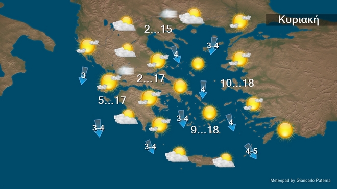 Οι άνεμοι στα δυτικά θα είναι μεταβλητοί 2 με 3 και στα ανατολικά βόρειοι βορειοανατολικοί έως 4 μποφόρ. Η θερμοκρασία δεν θα σημειώσει αξιόλογη μεταβολή και θα φθάσει στα βόρεια τους 13 με 15 βαθμούς, στις υπόλοιπες περιοχές τους 16 με 17 και στη νότια νησιωτική χώρα κατά τόπους τους 18 βαθμούς Κελσίου.