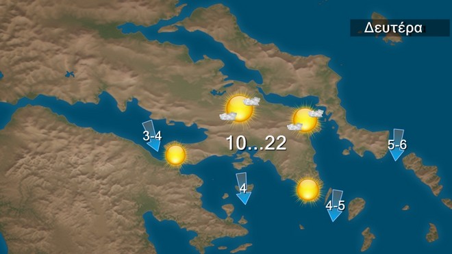 Για τη Μεγάλη Δευτέρα προβλέπεται γενικά αίθριος καιρός με πρόσκαιρες νεφώσεις τις μεσημβρινές και απογευματινές ώρες στα ηπειρωτικά, κυρίως τα ορεινά. Τοπικά περιορισμένη ορατότητα στα δυτικά και βόρεια τις πρωινές και βραδινές ώρες. Οι άνεμοι στο Αιγαίο από βόρειες διευθύνσεις 4 με 5 και πρόσκαιρα τις πρώτες πρωινές ώρες έως 6 μποφόρ, που βαθμιαία από τα βόρεια θα στραφούν νότιων διευθύνσεων και θα εξασθενήσουν. Η θερμοκρασία θα σημειώσει μικρή άνοδο στα βόρεια και θα φτάσει τους 21 βαθμούς, στα υπόλοιπα ηπειρωτικά και το Ιόνιο τους 23 βαθμούς και στο Αιγαίο τους 21 με 22 βαθμούς Κελσίου.