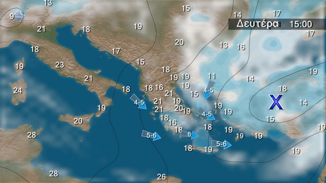 Στην ανατολική Μακεδονία, τη Θράκη και, κυρίως τις πρωινές ώρες, στα νησιά του βόρειου και ανατολικού Αιγαίου, νεφώσεις παροδικά αυξημένες με τοπικές βροχές και σποραδικές καταιγίδες. Εξασθένηση των φαινομένων από το βράδυ. Στην υπόλοιπη χώρα λίγες νεφώσεις που από το μεσημέρι στα Δωδεκάνησα και πρόσκαιρα τις μεσημβρινές και απογευματινές ώρες στα ηπειρωτικά θα αυξηθούν, οπότε θα σημειωθούν τοπικές βροχές και στα βορειότερα μεμονωμένες καταιγίδες. Οι άνεμοι θα πνέουν δυτικοί βορειοδυτικοί 3 με 5 και στα νότια και δυτικά πελάγη τοπικά 6 μποφόρ. Η θερμοκρασία θα σημειώσει μικρή πτώση στα βόρεια.
