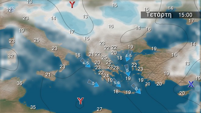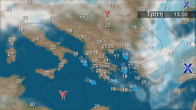 Στα βόρεια λίγες νεφώσεις που από το μεσημέρι βαθμιαία θα αυξηθούν και θα σημειωθούν τοπικές βροχές και κυρίως το απόγευμα στα βορειοανατολικά σποραδικές καταιγίδες. Στα υπόλοιπα αρχικά αίθριος καιρός. Από το μεσημέρι στα δυτικά και πρόσκαιρα τις μεσημβρινές και απογευματινές ώρες στα υπόλοιπα ηπειρωτικά, θα αναπτυχθούν τοπικές νεφώσεις, οπότε είναι πιθανό να σημειωθούν τοπικές βροχές κυρίως στα δυτικά. Οι άνεμοι θα πνέουν δυτικοί νοτιοδυτικοί 4 με 6 και στα νότια πελάγη τοπικά 7 μποφόρ. Η θερμοκρασία θα σημειώσει μικρή άνοδο στα νότια.