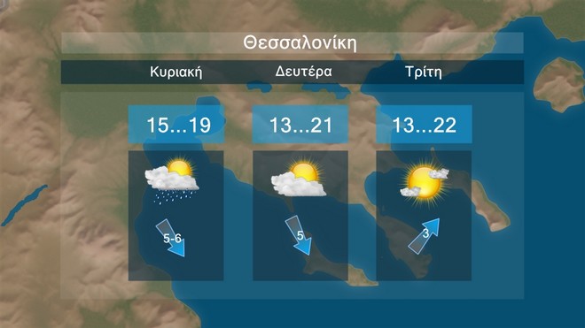Στη Θεσσαλονίκη ο καιρός θα κυλήσει με τοπικές νεφώσεις παροδικά αυξημένες και τοπικές μπόρες έως και την Κυριακή. Η θερμοκρασία θα έχει μέγιστες τιμές τους 19 με 22 βαθμούς Κελσίου.