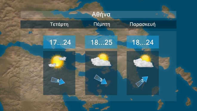 Σχεδόν αίθριος καιρός θα επικρατήσει στην Αθήνα με τοπικές νεφώσεις κατά περιόδους. Οι άνεμοι θα πνέουν ασθενείς και η θερμοκρασία θα έχει μέγιστες τιμές περί τους 24 με 25 βαθμούς Κελσίου.