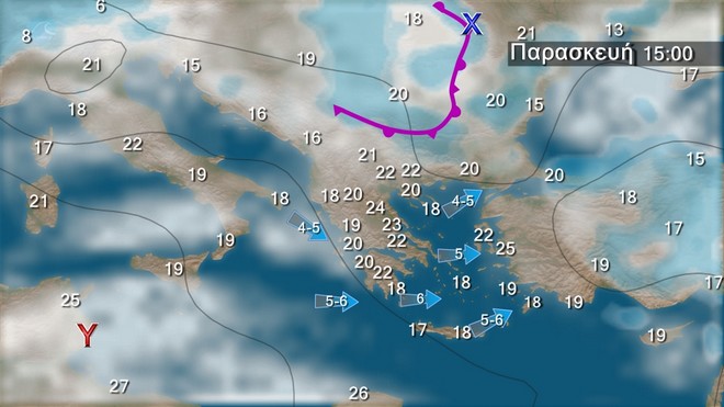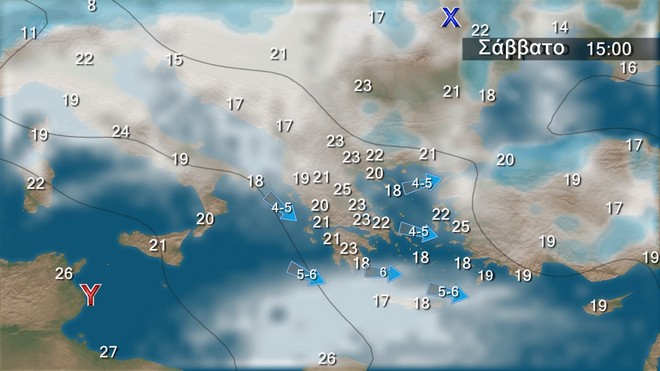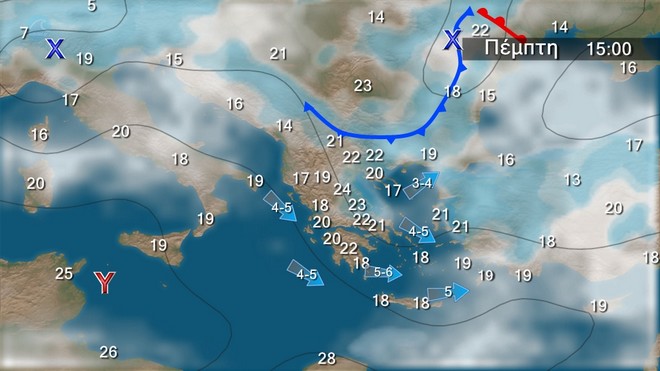 Στα δυτικά, τα βόρεια και την ανατολική νησιωτική χώρα, νεφώσεις με τοπικές βροχές και κυρίως τις μεσημβρινές και απογευματινές ώρες σποραδικές καταιγίδες. Στις υπόλοιπες περιοχές λίγες νεφώσεις παροδικά αυξημένες τις μεσημβρινές και απογευματινές ώρες στα ηπειρωτικά, με τοπικούς όμβρους κυρίως στα ορεινά. Οι άνεμοι θα πνέουν από δυτικές διευθύνσεις 4 με 6 και στα νότια πελάγη τοπικά έως 7 μποφόρ. Η θερμοκρασία θα σημειώσει πτώση στα δυτικά, τα κεντρικά και τα βόρεια.
