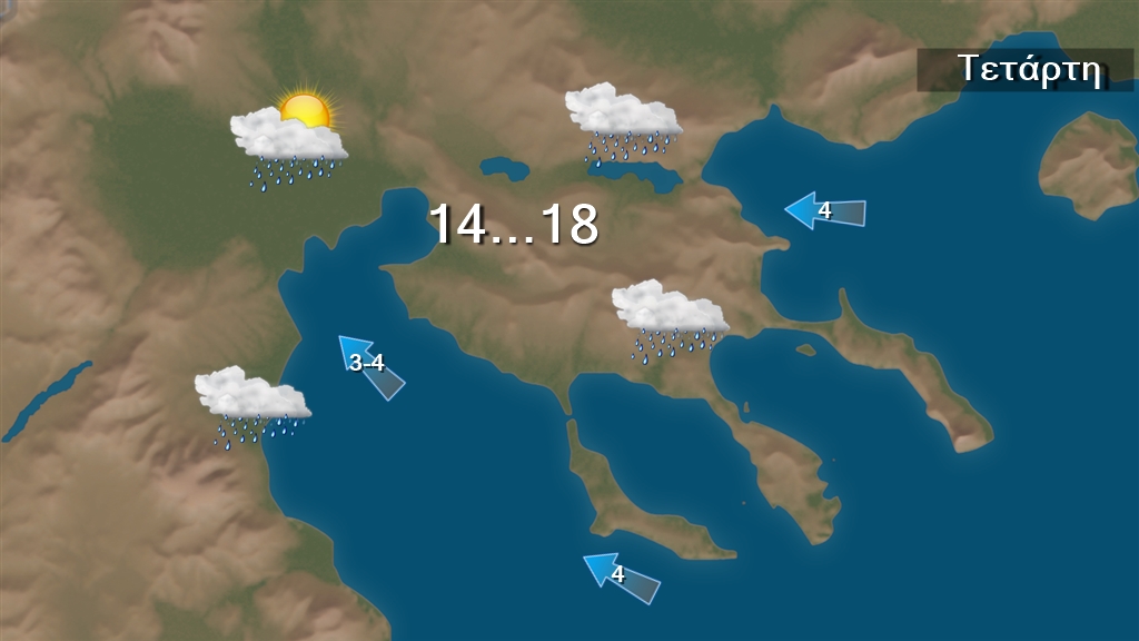 Σήμερα Τετάρτη Στα δυτικά, κεντρικά και βόρεια νεφώσεις με τοπικές βροχές και πιθανώς μεμονωμένες καταιγίδες με πρόσκαιρη βελτίωση στα κεντρικά και βόρεια από το απόγευμα. Στην υπόλοιπη χώρα κατά διαστήματα αυξημένες νεφώσεις με λίγες τοπικές βροχές και τις μεσημβρινές ώρες στα ηπειρωτικά ορεινά τοπικούς όμβρους. Οι μετεωρολογικές συνθήκες ευνοούν τη μεταφορά αφρικανικής σκόνης κυρίως στα νότια. Οι άνεμοι θα πνέουν βορειοανατολικοί 4 με 5 και τοπικά στο Αιγαίο και το νότιο Ιόνιο 6 μποφόρ. Η θερμοκρασία θα σημειώσει μικρή πτώση στα ανατολικά και θα φτάσει στα κεντρικά και τα βόρεια τους 18 με 19 βαθμούς και στην υπόλοιπη χώρα τους 20 με 22 βαθμούς Κελσίου.