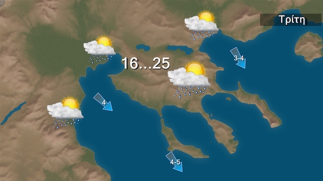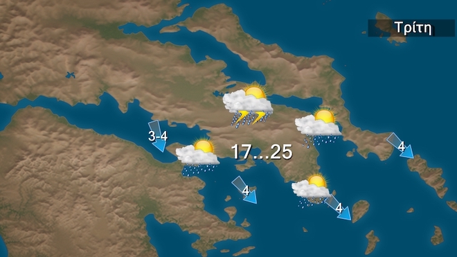 Την Τρίτη προβλέπεται άστατος καιρός, με τοπικές βροχές και σποραδικές καταιγίδες κυρίως στα ανατολικά και νότια ηπειρωτικά, τα νησιά του Αιγαίου και την Κρήτη. Τα φαινόμενα πιθανώς να είναι πρόσκαιρα ισχυρά στο Βόρειο Αιγαίο, την Ανατολική Στερεά, την Εύβοια και την Πελοπόννησο. Βελτίωση του καιρού αναμένεται από αργά το απόγευμα. Οι άνεμοι θα πνέουν από βόρειες διευθύνσεις 3 με 5 και στο βόρειο Ιόνιο το απόγευμα τοπικά 6 μποφόρ. Η θερμοκρασία θα σημειώσει πτώση κυρίως στα ανατολικά και βόρεια και θα φτάσει στα βόρεια τους 25 βαθμούς στο Ιόνιο και τα υπόλοιπα ηπειρωτικά τους 26 με 27 βαθμούς και στα νησιά του Αιγαίου τους 25 βαθμούς Κελσίου.