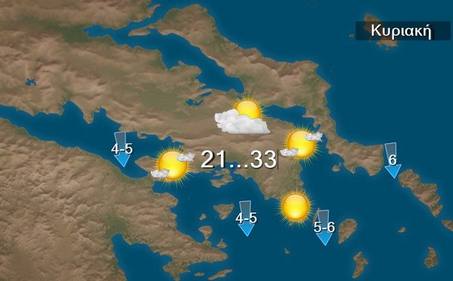 Την Κυριακή σε όλη τη χώρα προβλέπεται γενικά αίθριος καιρός με λίγες νεφώσεις στην ανατολική χώρα οι οποίες παροδικά θα είναι αυξημένες στη βόρεια Κρήτη, όπου ενδέχεται να σημειωθούν ασθενείς τοπικές βροχές. Τις μεσημβρινές και απογευματινές ώρες στα ηπειρωτικά θα αναπτυχθούν τοπικές νεφώσεις και ενδέχεται να σημειωθούν μεμονωμένοι όμβροι στα ορεινά.