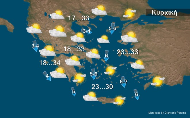 Το βράδυ οι νεφώσεις στα βόρεια θα αυξηθούν και αργά τη νύχτα θα σημειωθούν τοπικές βροχές. Οι άνεμοι θα πνέουν από βόρειες διευθύνσεις. Στα δυτικά 3 με 5 και βαθμιαία στο βόρειο Ιόνιο τοπικά 6 μποφόρ και στα ανατολικά 4 με 6 και στο Αιγαίο τοπικά 7 μποφόρ. Η θερμοκρασία στα ηπειρωτικά θα φθάσει τους 32 με 34 βαθμούς Κελσίου. Στις νησιωτικές περιοχές θα φθάσει τους 30 με 31 βαθμούς και κατά τόπους στη νότια Κρήτη και το ανατολικό Αιγαίο τους 32 με 33 βαθμούς Κελσίου. Σε όλη τη χώρα