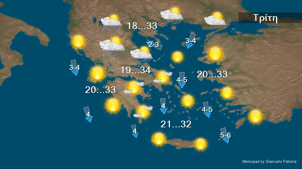 Γενικά αίθριος και πρόσκαιρα τις μεσημβρινές και απογευματινές ώρες θα αναπτυχθούν νεφώσεις στα ηπειρωτικά όπου θα σημειωθούν τοπικοί όμβροι, ενώ στην ανατολική Μακεδονία και τη Θράκη πιθανώς να εκδηλωθούν και μεμονωμένες καταιγίδες. Οι άνεμοι θα πνέουν από βόρειες διευθύνσεις 4 με 6 και βαθμιαία στα πελάγη τοπικά 7 μποφόρ. Η θερμοκρασία θα σημειώσει περαιτέρω μικρή άνοδο και τοπικά θα φτάσει τους 37 με 38 βαθμούς Κελσίου.