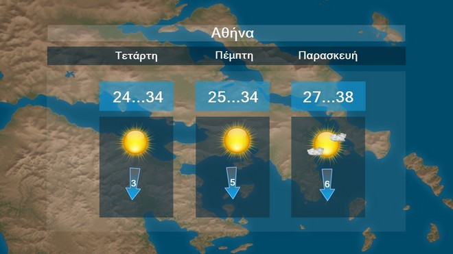 Στην Αθήνα προβλέπεται σχεδόν αίθριος καιρός. Η μέγιστη θερμοκρασία θα κυμαίνεται περί τους 34 με 38 βαθμούς Κελσίου.