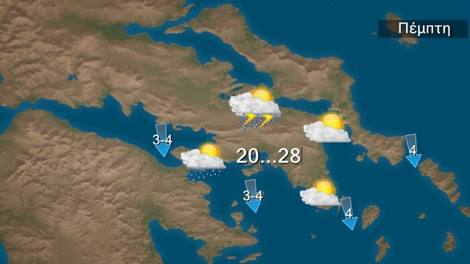 Την Πέμπτη στα ηπειρωτικά, τα νησιά του Ιονίου και την Κρήτη προβλέπονται βροχές και τις μεσημβρινές και απογευματινές ώρες, κυρίως στα ηπειρωτικά, σποραδικές καταιγίδες. Στην υπόλοιπη χώρα θα επικρατήσει γενικά αίθριος καιρός με λίγες πρόσκαιρες νεφώσεις. Οι άνεμοι θα πνέουν βόρειοι βορειοδυτικοί 3 με 5 και στο Αιγαίο τοπικά έως 6 μποφόρ. Η θερμοκρασία δεν θα αλλάξει σημαντικά και θα φτάσει στα βόρεια τους 27 βαθμούς στο Ιόνιο και τα υπόλοιπα ηπειρωτικά τους 27 με 29 βαθμούς και στα νησιά του Αιγαίου τους 26 με 27 βαθμούς Κελσίου