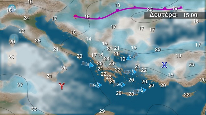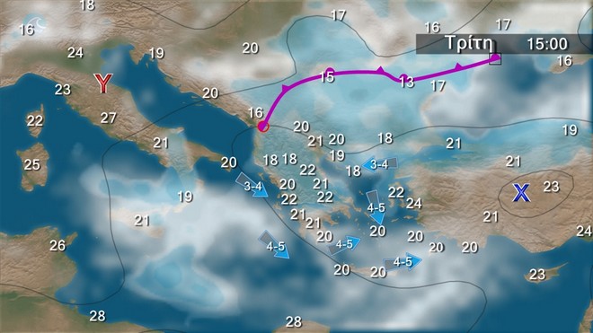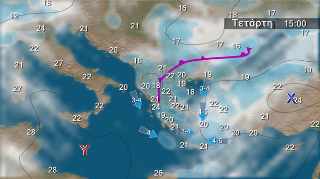 Στα νησιά του βορείου και ανατολικού Αιγαίου, τα Δωδεκάνησα, την κεντρική και την ανατολική Μακεδονία, τη Θράκη και τις μεσημβρινές και απογευματινές ώρες στα υπόλοιπα ηπειρωτικά, νεφώσεις με τοπικές βροχές και σποραδικές καταιγίδες. Στην υπόλοιπη χώρα λίγες νεφώσεις, πρόσκαιρα αυξημένες τις απογευματινές ώρες, με πιθανότητα σποραδικών βροχών κυρίως στην Κρήτη. Οι άνεμοι θα πνέουν στα δυτικά και βαθμιαία στα κεντρικά και νότια δυτικοί βορειοδυτικοί 4 με 5 και τοπικά 6 μποφόρ. Στην υπόλοιπη χώρα από νότιες διευθύνσεις 3 με 5 μποφόρ. Η θερμοκρασία δεν θα σημειώσει αξιόλογη μεταβολή.