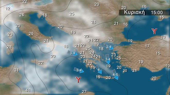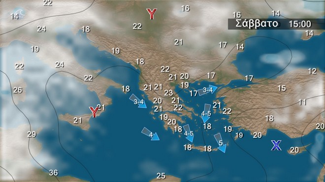 Στην ανατολική και νότια νησιωτική χώρα τοπικές νεφώσεις τις πρωινές ώρες με πιθανότητα τοπικών βροχών στα Δωδεκάνησα.Στην υπόλοιπη χώρα γενικά αίθριος καιρός και μόνο στα βορειοανατολικά τις απογευματινές ώρες, θα αναπτυχθούν πρόσκαιρες νεφώσεις.Οι άνεμοι θα πνέουν βόρειοι βορειοδυτικοί 4 με 6 και στα νοτιοανατολικά τοπικά 7 με σταδιακή εξασθένηση από το απόγευμα. Η θερμοκρασία θα σημειώσει μικρή άνοδο κυρίως ως προς τις μέγιστες τιμές της.