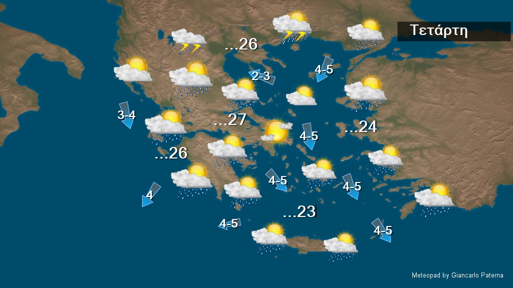 Στις Κυκλάδες, την Κρήτη και το ανατολικό Αιγαίο από τη Σάμο και νοτιότερα νεφώσεις με τοπικές βροχές και σποραδικές καταιγίδες με βαθμιαία βελτίωση από το μεσημέρι. Στην υπόλοιπη χώρα λίγες νεφώσεις παροδικά αυξημένες τις μεσημβρινές και απογευματινές ώρες στα ηπειρωτικά όπου θα εκδηλωθούν τοπικοί όμβροι ή μεμονωμένες καταιγίδες. Η ορατότητα τις πρωινές ώρες στα βόρεια ηπειρωτικά θα είναι τοπικά περιορισμένη. Οι άνεμοι θα πνέουν από βόρειες διευθύνσεις 3 με 5 μποφόρ. Η θερμοκρασία θα σημειώσει μικρή άνοδο και θα φτάσει τους 23 με 25 βαθμούς Κελσίου.