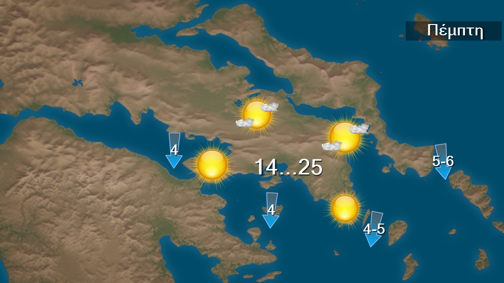 Στην Αττική προβλέπεται γενικά αίθριος καιρός με λίγες πρόσκαιρες νεφώσεις τις πρωινές ώρες. Οι άνεμοι θα πνέουν βόρειοι βορειοανατολικοί 4 με 5 μποφόρ και στα ανατολικά τοπικά έως 6 μποφόρ. Η θερμοκρασία θα κυμανθεί από 14 έως 25 βαθμούς Κελσίου.