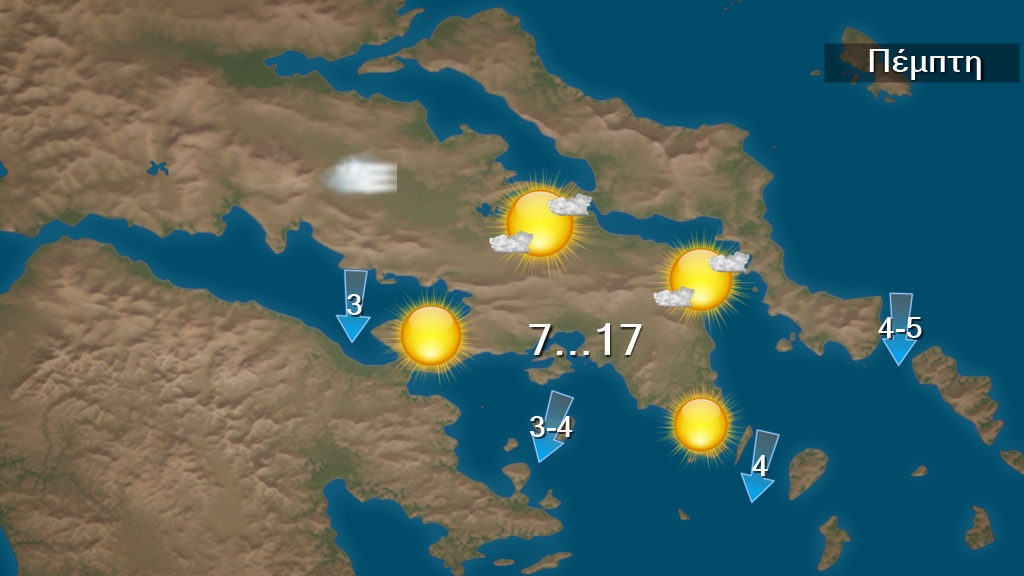 Στην Αττική προβλέπεται γενικά αίθριος καιρός με λίγες νεφώσεις παροδικά αυξημένες τις πρωινές ώρες. Η ορατότητα τις πρωινές ώρες θα είναι τοπικά περιορισμένη. Οι άνεμοι θα πνέουν από βόρειες διευθύνσεις 3 με 4 στα ανατολικά έως 5 μποφόρ. Η θερμοκρασία θα κυμανθεί από 7 έως 17 βαθμούς Κελσίου.