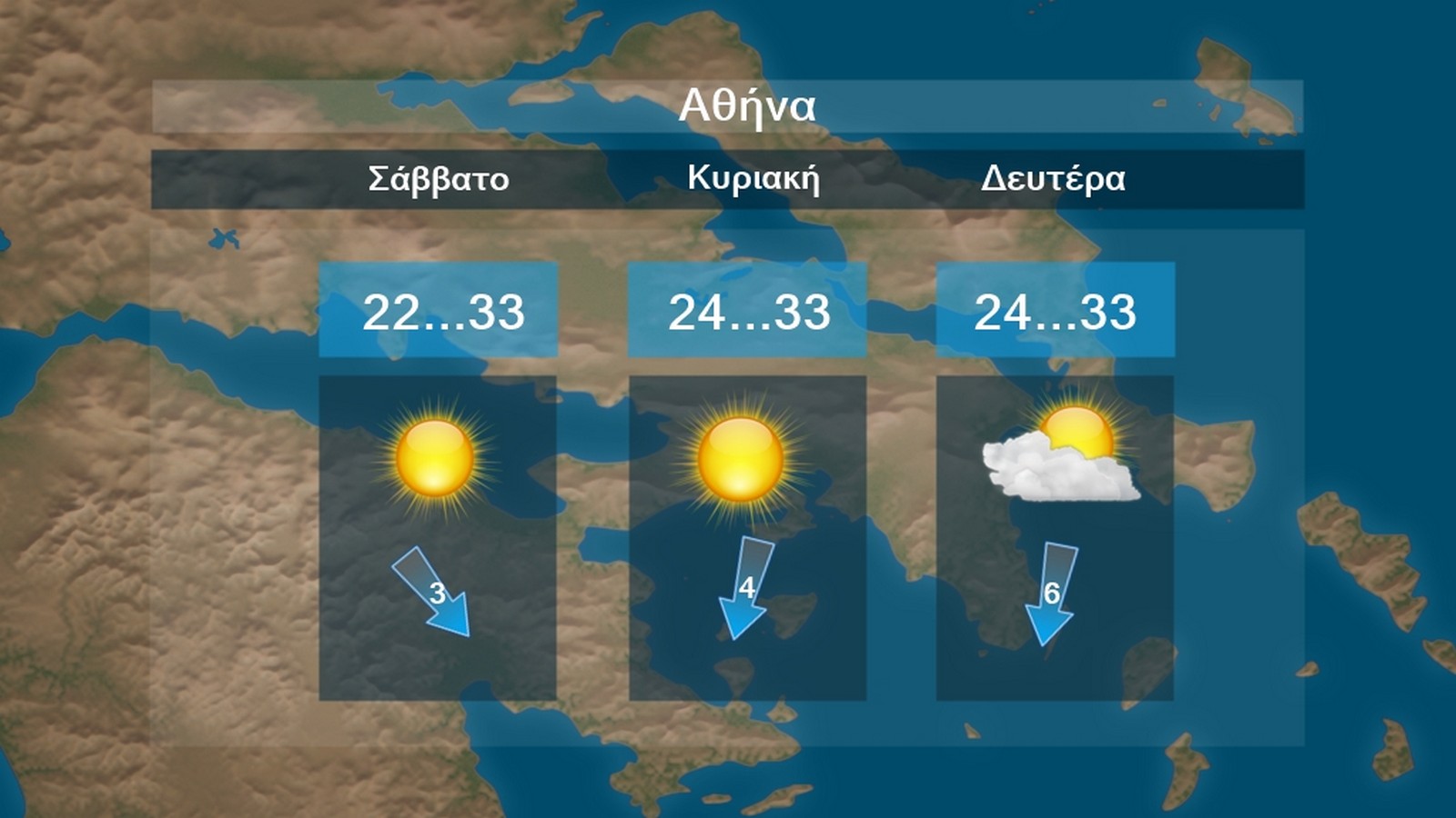 Στην Αττική προβλέπεται γενικά αίθριος καιρός με αραιές νεφώσεις κατά διαστήματα. Οι άνεμοι θα πνέουν βορειοδυτικοί 3 με 5 μποφόρ και από το μεσημέρι νότιοι. Η θερμοκρασία θα κυμανθεί από 22 έως 35 βαθμούς Κελσίου.