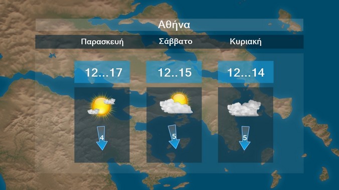 Στην Αττική προβλέπεται γενικά αίθριος καιρός. Οι άνεμοι θα πνέουν δυτικοί βορειοδυτικοί 4 με 6 μποφόρ και η θερμοκρασία θα κυμανθεί από 11 έως 20 βαθμούς Κελσίου.