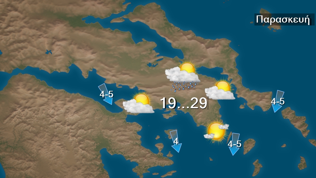 Στην Αττική προβλέπονται λίγες νεφώσεις κατά διαστήματα αυξημένες με τοπικούς όμβρους από το μεσημέρι. Οι άνεμοι θα πνέουν βόρειοι βορειοανατολικοί 3 με 5 μποφόρ. Από το απόγευμα και από τα δυτικά θα επικρατήσουν δυτικοί βορειοδυτικοί άνεμοι με την ίδια ένταση. Η θερμοκρασία θα κυμανθεί από 19 έως 29 βαθμούς Κελσίου.