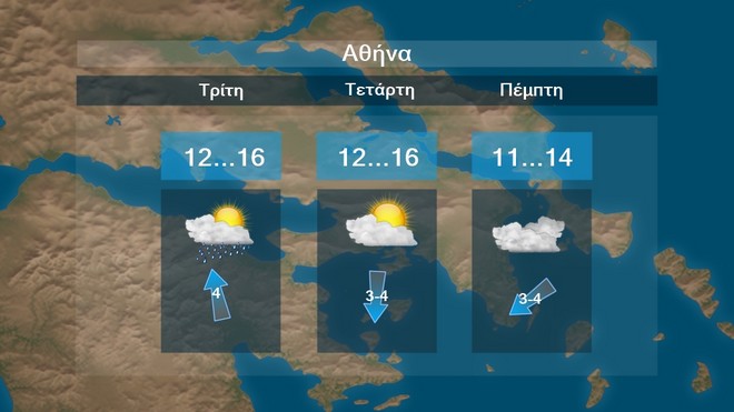 Στην Αθήνα προβλέπονται νεφώσεις με λίγες βροχές. Η μέγιστη θερμοκρασία θα κυμαίνεται περί τους 14 με 16 βαθμούς Κελσίου.